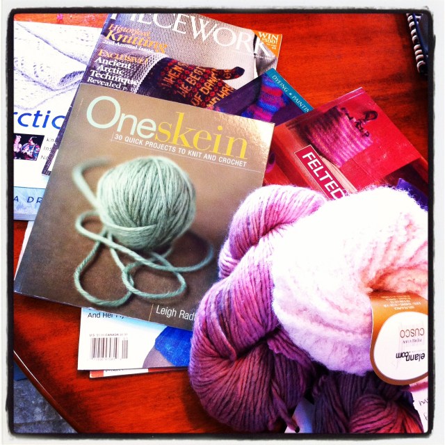 I’m also enjoying a lot of knitting time when I can, and I’ve started on a second ear warmer and really enjoying this treasure trove of knitting items from Cassie! She was so sweet and sent me this beautiful yarn, some knitting magazines and great books when she was cleaning out her knitting stash. Thank you so much, Cassie!!