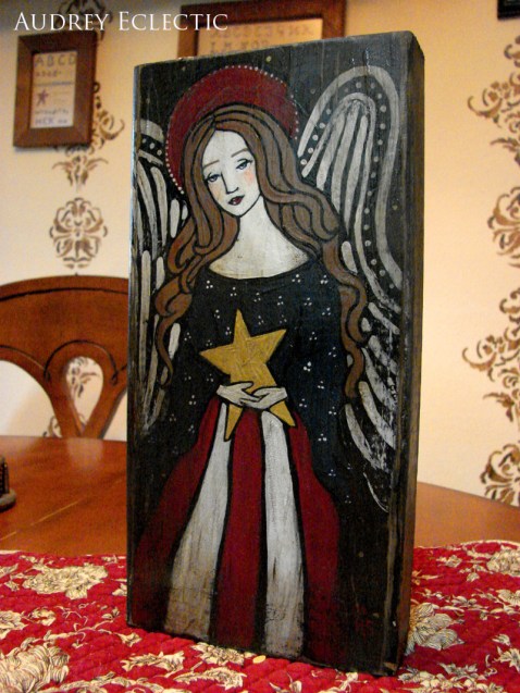 I have been hard at work lately on some custom pieces, and I wanted to show you a couple that I’ve finished and have sent to their homes. The first is this American flag inspired angel which I made as a special gift. Last summer our neighbor and Oklahoma National Guard staff sergeant lost his life in Afghanistan. Last summer was a really, really hard year for the Oklahoma units and it just made my heart ache for his wonderful family and all those families who lost their loved ones. This summer our neighborhood decided to dedicate our neighborhood playground in his honor and I wanted to also make a little something special for the family to let them know that they were still in my thoughts and prayers, so I created this little angel as my humble thanks to them. I created her in a classic Americana style and while it might be hard to tell from a photo, the star was painted in a gold paint that has lots of shine, and there is also some gold detail in the halo. I was happy to make this for my neighbors, they are a really great family.