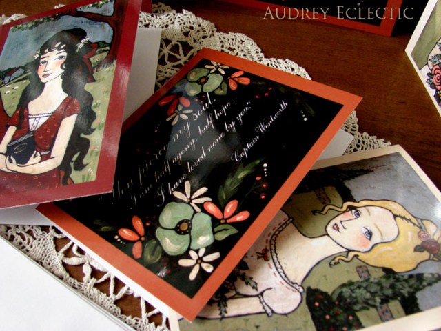 In other news, the Jane Austen Collection of notecards are now available in my etsy shop! I hope you like them! They are perfect to send little notes to a fellow book lover, and can work any time of year. I think they’d also be nice for wedding cards or for a bridal shower, since Austen was so adept at romance. There are still several sets left in the shop: