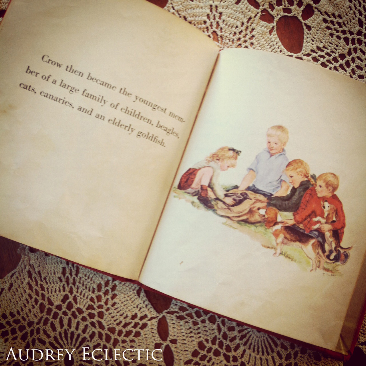 The illustrations in the book are very sweet and the story most autobiographical because the Tudor clan did have a pet crow called Edgar Allen Crow. What I love about these little books are the childhoods depicted with lots of animals scurrying around, because that’s how my childhood was (although I never had anything as exotic as a crow. I did have a pet monarch butterfly though! Til she hitched a ride to Mexico 😉 )