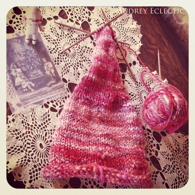 Aside from being an amazing artist, Tasha Tudor was also a prolific knitter. Last year I made a Tasha-inspired shawl, and I’d like to make more. Lately I’ve been getting used to working with double pointed needles and using them to create this funny little gnome hat for Audrey!