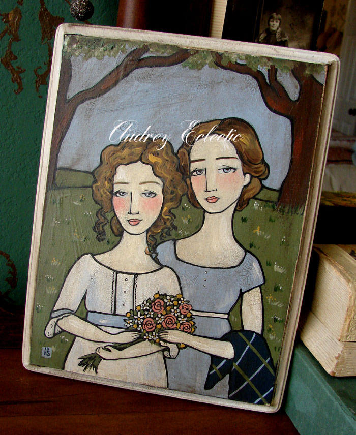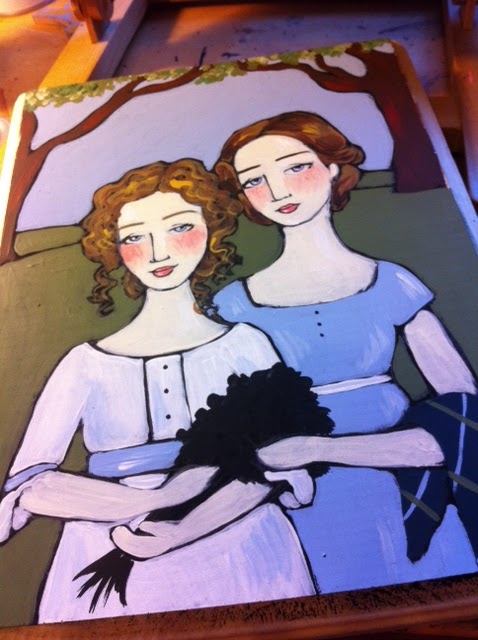 I just finished up this painting this morning, and I’m so happy with how it turned out! It’s Elinor and Marianne– The Dashwood sisters from Sense and Sensibility. I’m continuing my collection of Jane Austen characters (I’ve already got an “Emma” and “Lizzie” that you can now buy in my etsy shop.)