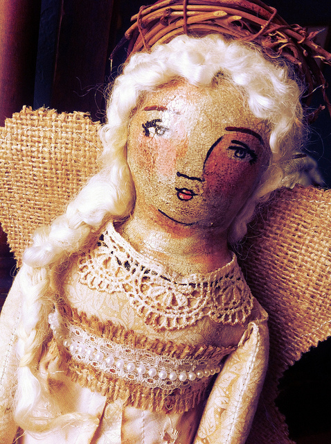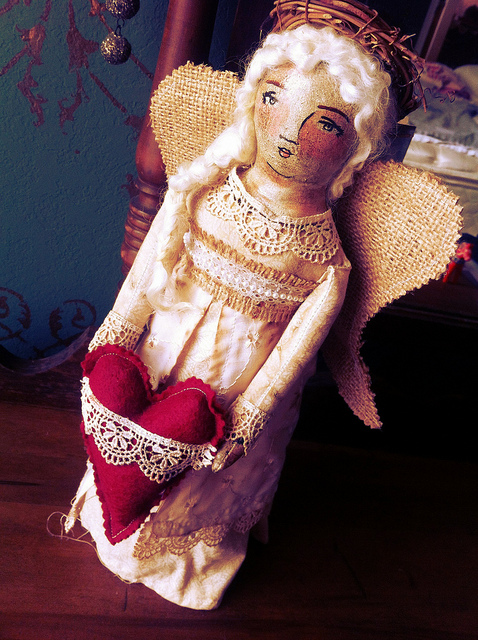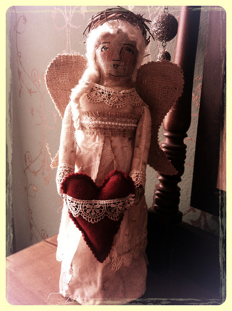 Just yesterday I finished a large angel doll commission, and I’m excited to share her with you! I thought she came out really nicely– a balance of rustic and feminine with her burlap wings and belt and lace edges.