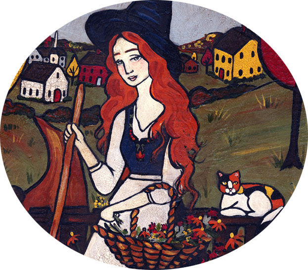 I also wanted to paint a quaint little New England village because surely, all of those sleepy little villages must have had a cute little witch to spice things up, right? Imagine the trouble she caused 😉 or imagine the young ladies sneaking up the path to her gate for a love potion or something to pinken their cheeks and brighten their eyes so a certain young man would notice them? I’m sure this little witch would be much obliging.