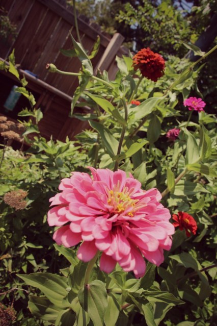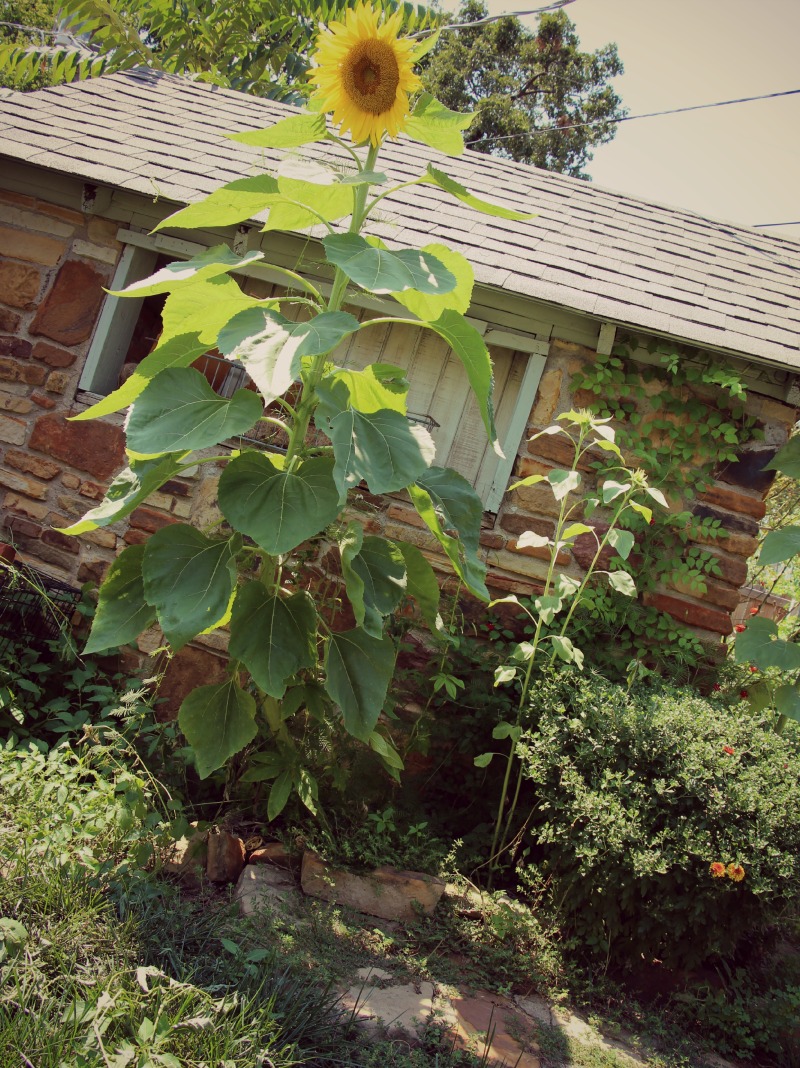 I do love my yard in the mornings when it’s not too hot. The back garden is a bit of a jungle because I just don’t have the endurance in the heat to really hack at it. But there are some beautiful zenias bursting forth out of the bramble, and some giant sunflowers living up to their names. It’s the end of August in bloom, and I will enjoy it for the flower’s sake.
