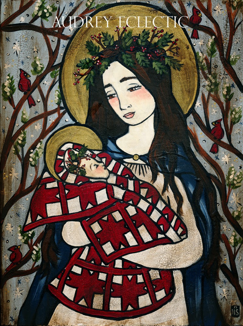 It is a gray, rainy November day here, and I’ve just put the finishing touches on this pretty little painting— which I think turned out so pretty! It’s called “Woodland Madonna and Child” and is my sort of rustic, homespun rendition of Mary and the Christ child. For this winter I think I am loving the look red and white quilts— the ultimate in comfy coziness! I thought it would be sweet and unexpected to add one in this piece– as well as cardinals, my favorite winter bird.