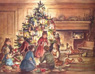 Well, here it is– December. It came all of a sudden, or so it seems to me, even though I’ve been planning for the Christmas season with my art for months! It is also my favorite time in Tasha’s illustrations and books— and the beautiful trees and simple festivities, families gathered together in the glow of candle light while a winter wonderland lays sleepy outside.