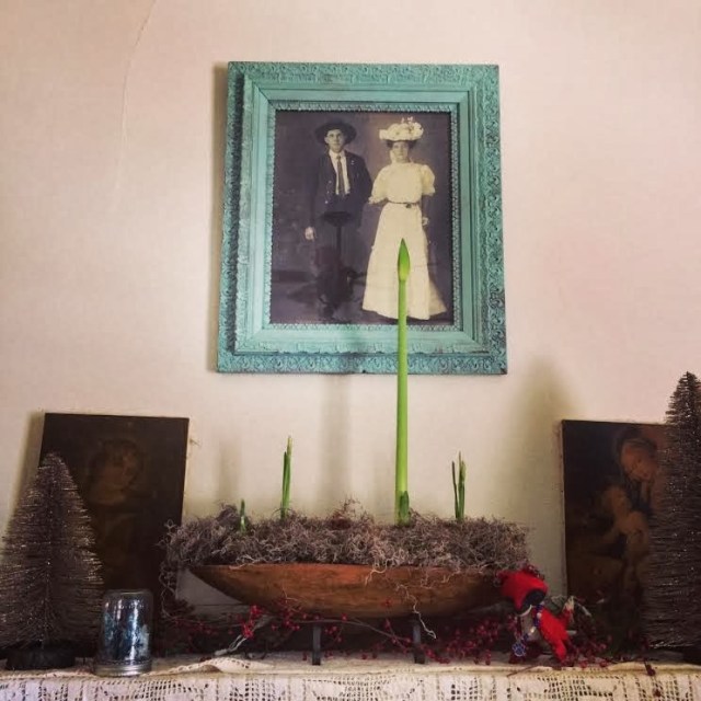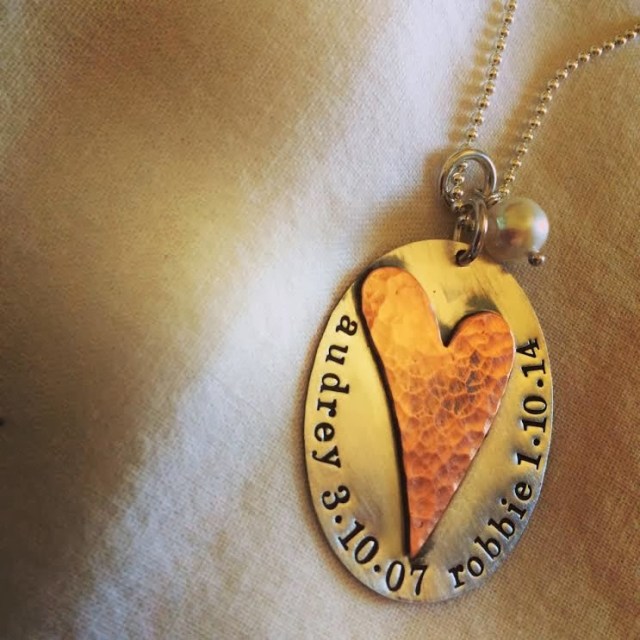 Some little treats we’ve been enjoying around the house include some homemade apple sauce, watching the “Christmas bulbs” grow at such a slow pace it could be spring before we actually see flowers, and loving all the kindness of friends and family who bring us food and come to visit– or give us special keepsakes like the beautiful necklace that my mom had made for me from The Vintage Pearl, shown above. It has Audrey and Robbie’s names and birthdays stamped in it, and a copper heart in the center– plus a pretty pearl (have I told you that lately Im liking pearls a lot? Must be my old age settling in…)