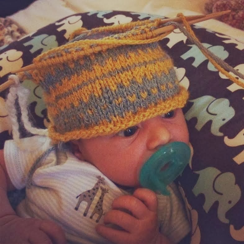 Hello there! Just thought I’d stop by and let you know that we’re doing fine, lots of winter cuddles and trying to figure out this thing called ‘life with a baby.’ Still trying to get into a routine– some days are better than others. Some days he’s feeling good and napping well, others…not so much 😉 But over all, Robbie is such a sweet and lovable little guy. Looks, he even lets his mama check her knitting progress on his little noggin. How cute is that???