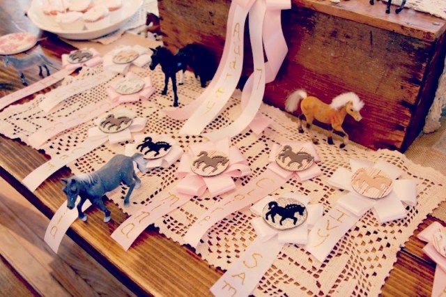 To compliment the yummies and the pony decor, we used several of Audrey’s toy horses as decorations, and made tiny bunting for the cupcakes and cake. I think it came out really well! I even made each kid a ‘horse show ribbon’ for their favor. They may have been a little wonky, but hey! They were made in the USA, right? 😉