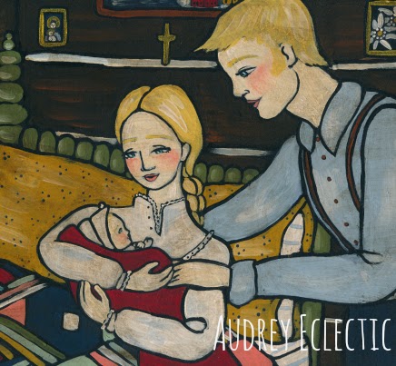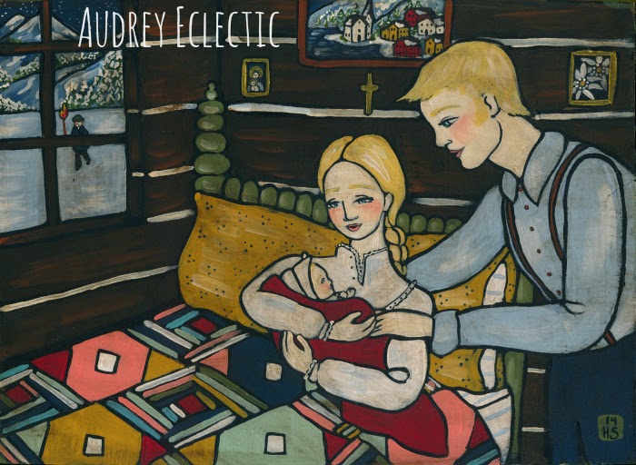 Research for this included: watching “Rick Steve’s Europe Christmas Special” and “The Sound of Music.” Which, I am disappointed to realize, shows NO winter in Saltzburg at all! How can that be!?! Its such a beautiful place all covered in snow! However, it did inspire me to tuck some Edelweiss into the scene (can you spot it?) and I painted a portrait of Saltzburg the town in the painting hanging above the bed. So there’s a little city and a little country all in the painting.