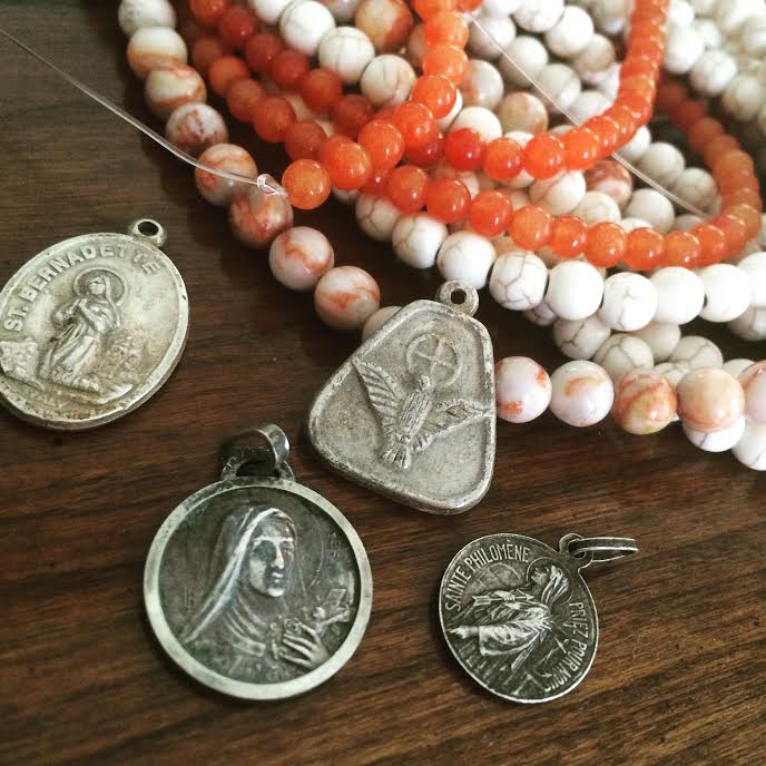 And now, the weekend approaches; gonna try to get some cleaning and errands out of the way so I can fully enjoy it. Last weekend I attended the gem show in Tulsa and got some nice beads and antique religious medals, I love them! Can’t wait to create some cool new jewelry with them. Particularly love the charm with the dove and the french St. Philomene medal.