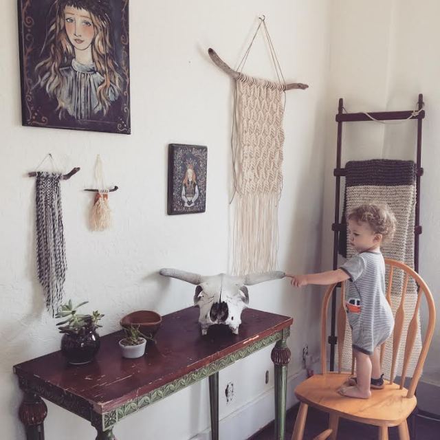 That large, cream colored wall hanging in the top photo is absolutely amazing! I love it. And I think you are doing a great job with your first weaving- great minds think alike: I like everything in my house to look like it is 100 years old and came out of an old trunk in the attic after a house fire! 🙂 Great way to put it!!