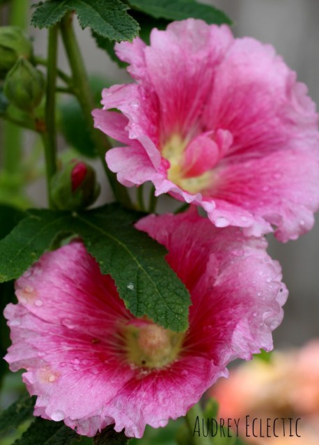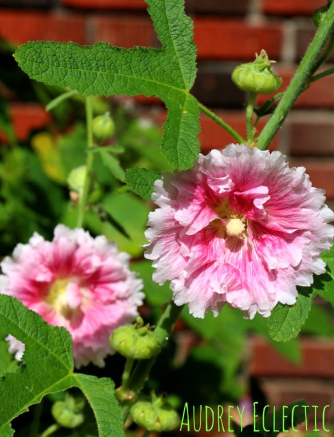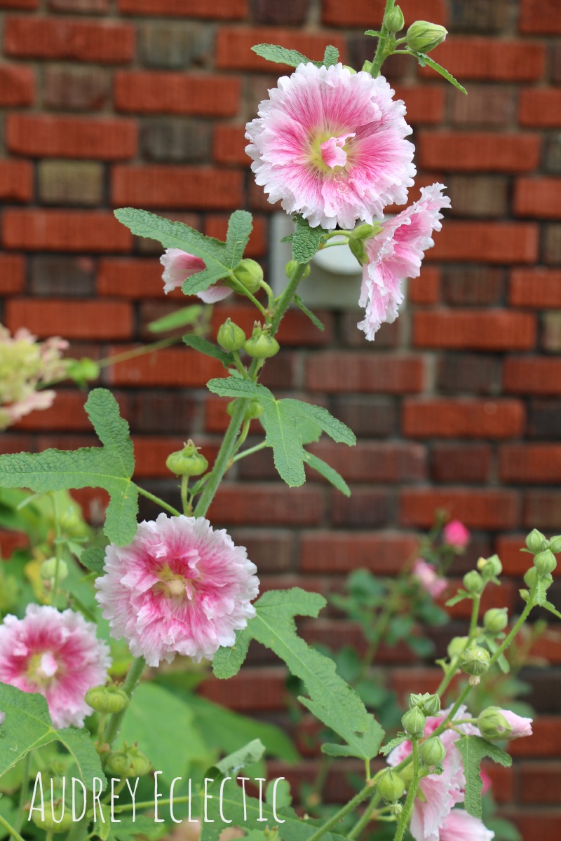 A cool and very very wet spring has made way for hotter and sunnier days, and my garden is in full bloom! Many of the things I planted our first spring here are now mature, and for the first year ever we’ve got hollyhocks blooming everywhere! All the seeds that took seem to be pinks, in a wide range of shades. So, so pretty! Hollyhocks are the sweetest flowers, one of my very favorites!
