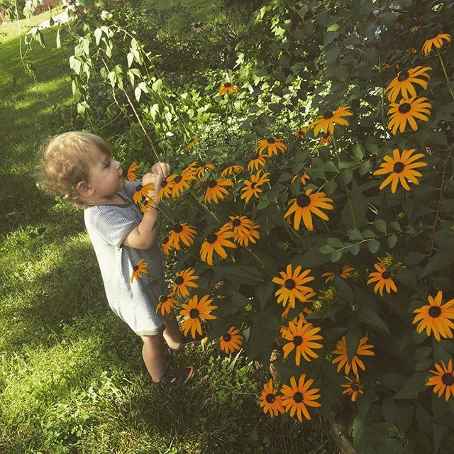 Yet in photos, of course, it can be lovely. The flower beds are in full bloom— the black eyed susans have bloomed and my little garden helper was so nice and gentle with them– no picking! Just smelling.