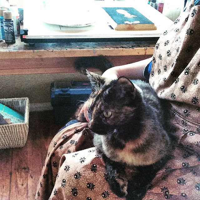 And so, we have taken in our first foster— a tortoise color female kitty who is very very pregnant. She lives in the art studio, where she puts her big belly on the cool wood floor and she likes to sit under my chair or on my art desk while I paint. Perhaps she’s just exhausted, haha, but she is such a well mannered and loving cat. We have named her Lucy Maud (after that Lucy Maud) and each morning Audrey rushes over to check to see if the kittens have come.
