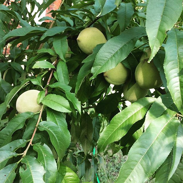 Mornings are my favorite time of day in the summer. Things have cooled (slightly) in the night. This is when I do my impersonation of jogging, then check over the yard and the garden, watering, and seeing what’s ripened. This year it looks like we’ll have a real peach harvest! Audrey’s tree is heavy with fruit— Robbie’s tree, the baby tree, still has some growing to do.