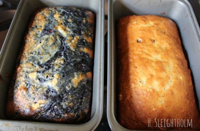 I also love to make banana bread in my “eh, whatever is in the pantry!” method of cooking— I made two loaves to cut up and keep for grazing during my last baking day; one with chocolate chips and the other with a batch of nearly-over-ripe blackberries we had.