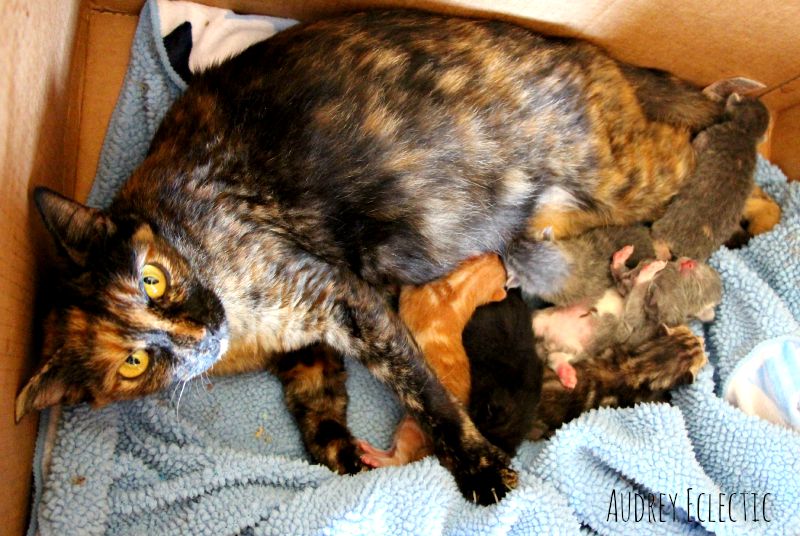 I’ll admit I got a little teary eyed watching her clean them up and get them moving and they crawling around, blink, looking for milk and then drinking it up with ferocious abandon. I think about how the woman at the shelter told me that this mama cat had been caught in a trap and then brought into the shelter, where she’d languished, already heavily pregnant, for more than a month. What a pleasure it is to have been able to give her a safe cool place to make her nest and welcome her babies.
