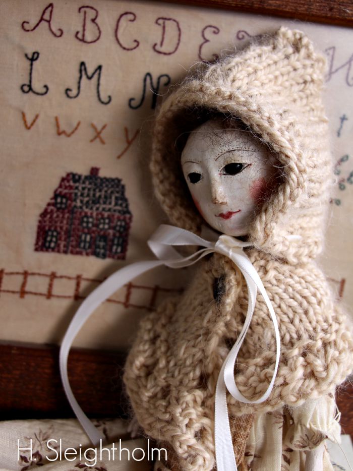 And so I’ve been inspired to get out my own knitting needles to make some little things— a pointed little cap with a ribbon tie and lacy edged capelet with antique button to fasten it closed. The duo fit just perfectly on my little doll made by my talented dollmaker friend Christine Crocker. Christine is another Tasha Tudor lover, and it was my pleasure to get to ramble through Tasha’s garden with her— as well as Deefield Massachusetts! The dolls she makes are inspired by the antique Queen Anne style dolls that was used as dressmaker models in the 1700s— and I’m sure Tasha would have loved them.