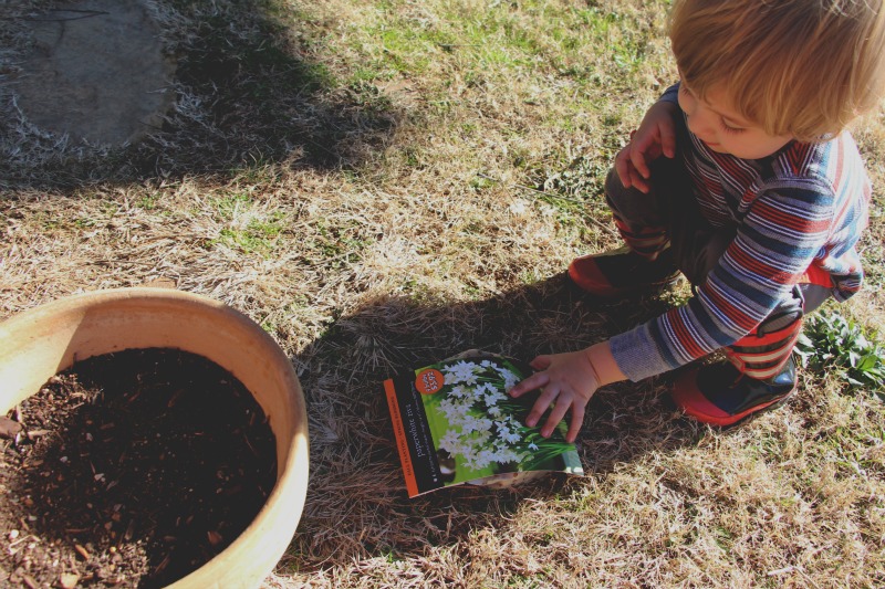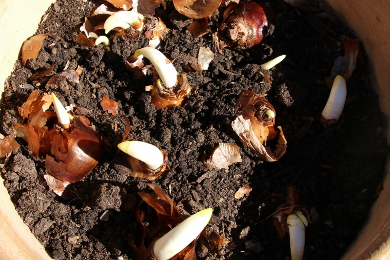 We planted Paper Whites in an old pot, and the bulbs were already sprouting in the bag! Paper Whites are fun because they’ll start growing as soon as they get a little care— they dont need a dormant period of cold like other bulbs do. I’m hoping these little guys will be ready to bloom by Easter, which is coming early this year.