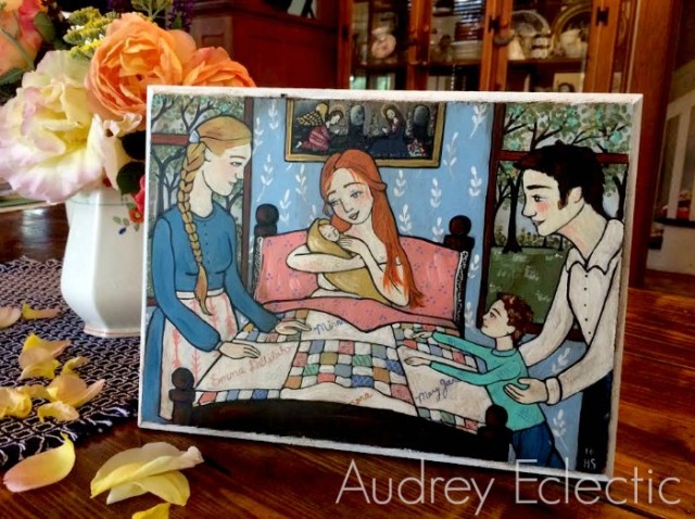 That concept, and the happy deluge of little babies and expected babies I am so thrilled to see coming into the world inspired this latest painting, “Born At Home.” The feeling behind this piece is one of happiness, joy, and the sanctuary of home. I love how, even if our babies arent actually born literally at home, the concept of simplicity and family environment has started making such a comeback in our culture. There is a push back against making pregnancy and birth seem like an illness and something to view in a clinical light. I love the concept of raising a family naturally, simply, without a lot of fuss and pressure.