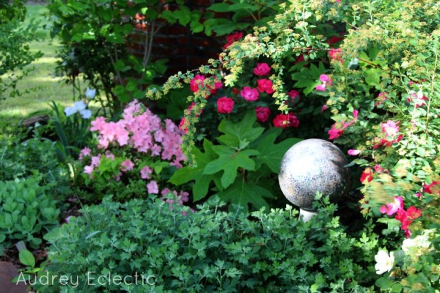 | A shady patch of our garden is home to oak leaf hydrangea, azaleas, some roses, a small Dogwood tree and a while flowering mystery shrub whose name I dont know! |