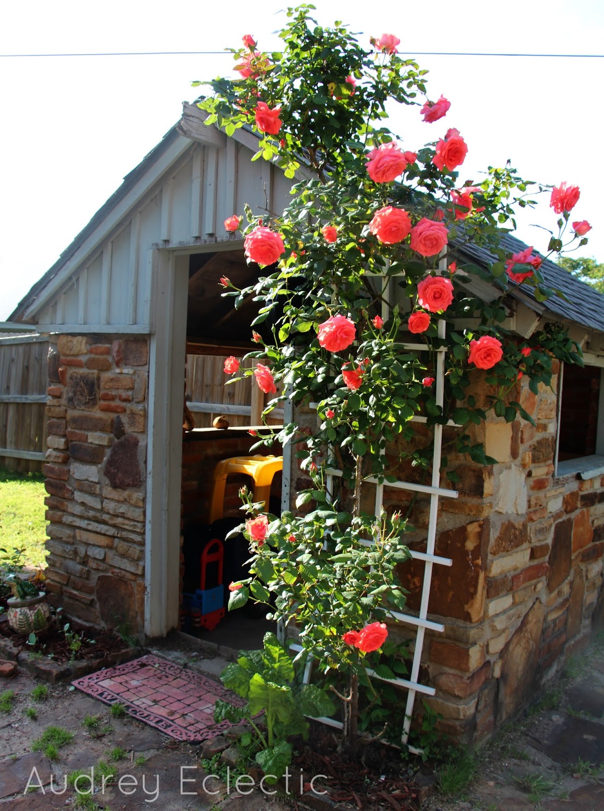 | Our little stone shed-turned-playhouse framed with some salmon colored roses. These were here when we moved in and were such a wonderful surprise! |