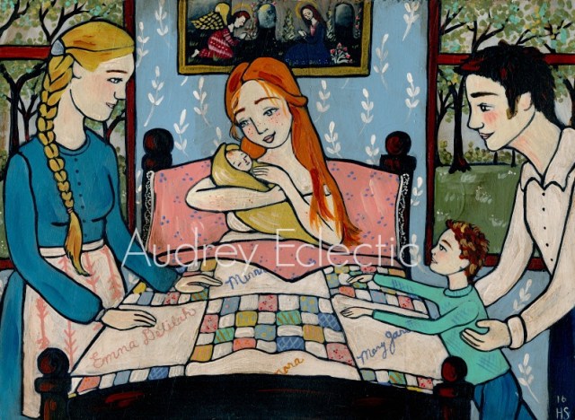 “Born At Home” is one of my newest pieces– the original is still available in my etsy shop and I also have prints. I thought this piece would be perfect for a giveaway—- and can be given in many different contexts— a family with a new addition, to a nurse or midwife, a family celebration, a birthday….it’s really up to you and why it may catch your fancy!