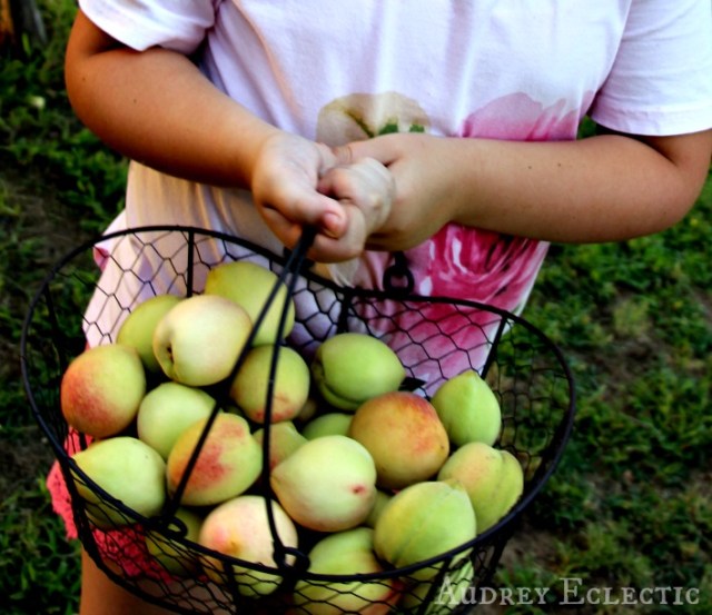 It’s been a scorching last few weeks. Topped with violent storms and tons of rain, but evidently it was a mix that was right for ripening peaches. The kids and I went out with baskets to collect what had survived rain, hail, rain, wind and heat and I was amazed at how much fruit we actually got!