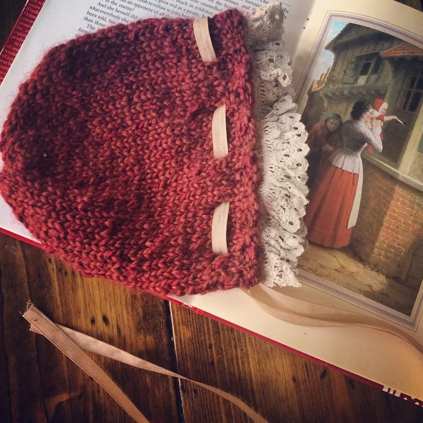 I’ve really been enjoying my time at my spinning wheel and making yarn, and also creating some sweet little knitted caps. I had an idea to make a really sweet, old fashioned bonnet for little ones. Something that looks straight out of Cranford or Larkrise to Candleford. I am working on refining the pattern and hope to share it in my shop very soon….as well as some already made, ready to order little caps.