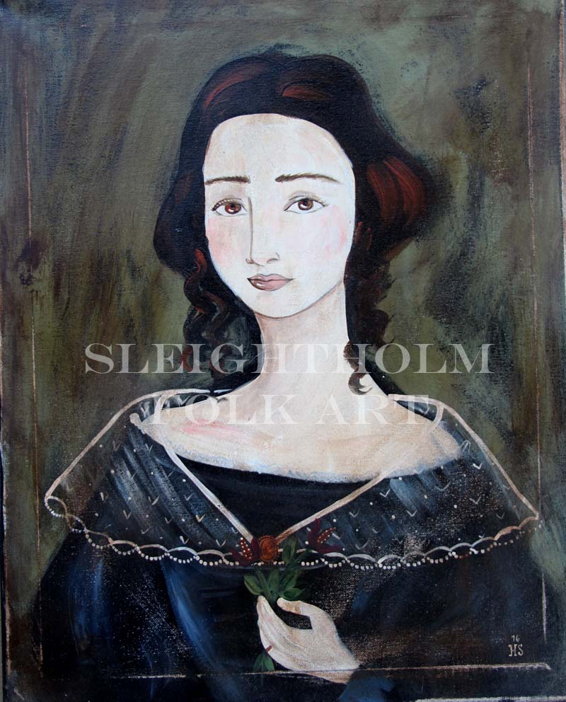 My love for Early American portraits inspired me to create this painting, that I decided to call “Mrs. Hawthorne.” Whoever buys her can give her her first name:
