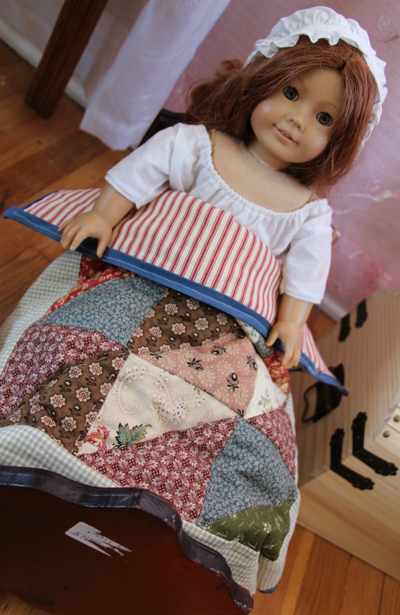 I ordered her one dress from this great etsy shop that sources tons of good quality and vintage American Girl Doll items, and also challenged myself to make a dress for the doll and a quilt and mattress and pillow set for a little bed we found at the antique mall. The mattress and pillow are made from simple red and white ticking, and the quilt is made up of triangles of heritage pattern fabrics (some of which came from our visit to Old Sturbridge Village, and others from a little quilt shop we have here in town).