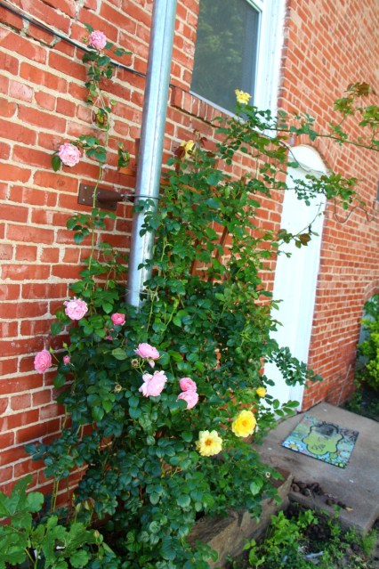 It’s a funny little piece of spring here— the roses have bloomed, but it keeps turning stormy and cold. These pretty climbing roses ( a hearty yellow climber from the feed store and a cherished David Austin Rose called ‘Strawberry Hill) seem to have done alright though….they’re on the east facing wall of the studio, and so are protected by 101 year old brick work from the squalls that run in from the west.