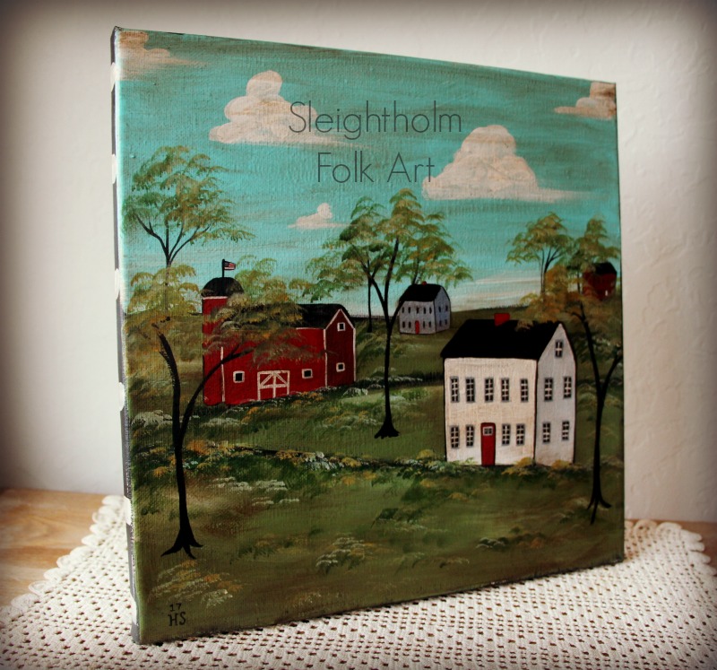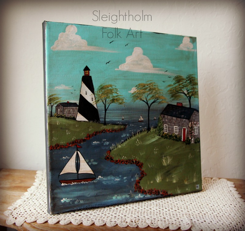 Some of my most recent folk art pieces are these fun 12×12″ landscape pieces, made just in time for the warm summer months. I had so much fun painting these iconic American themes— and was inspired to paint one focusing on the ocean and New England island life, and another an old fashioned farm homestead.