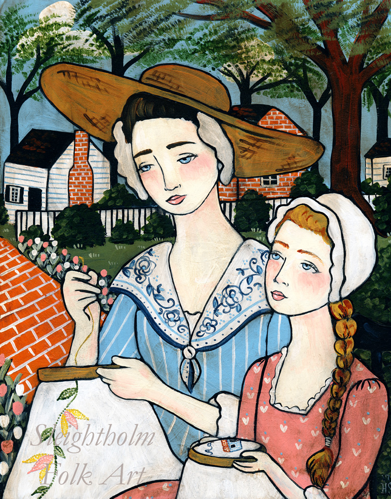 Here is my latest painting in my Colonial Crafters series! This piece depicts a mother and daughter sewing in a Williamsburg inspired garden area. I love the rusty brick and white houses of Williamsburg, and it reminds me a bit of my carriage house studio, which has a bit of Georgian style on its own!