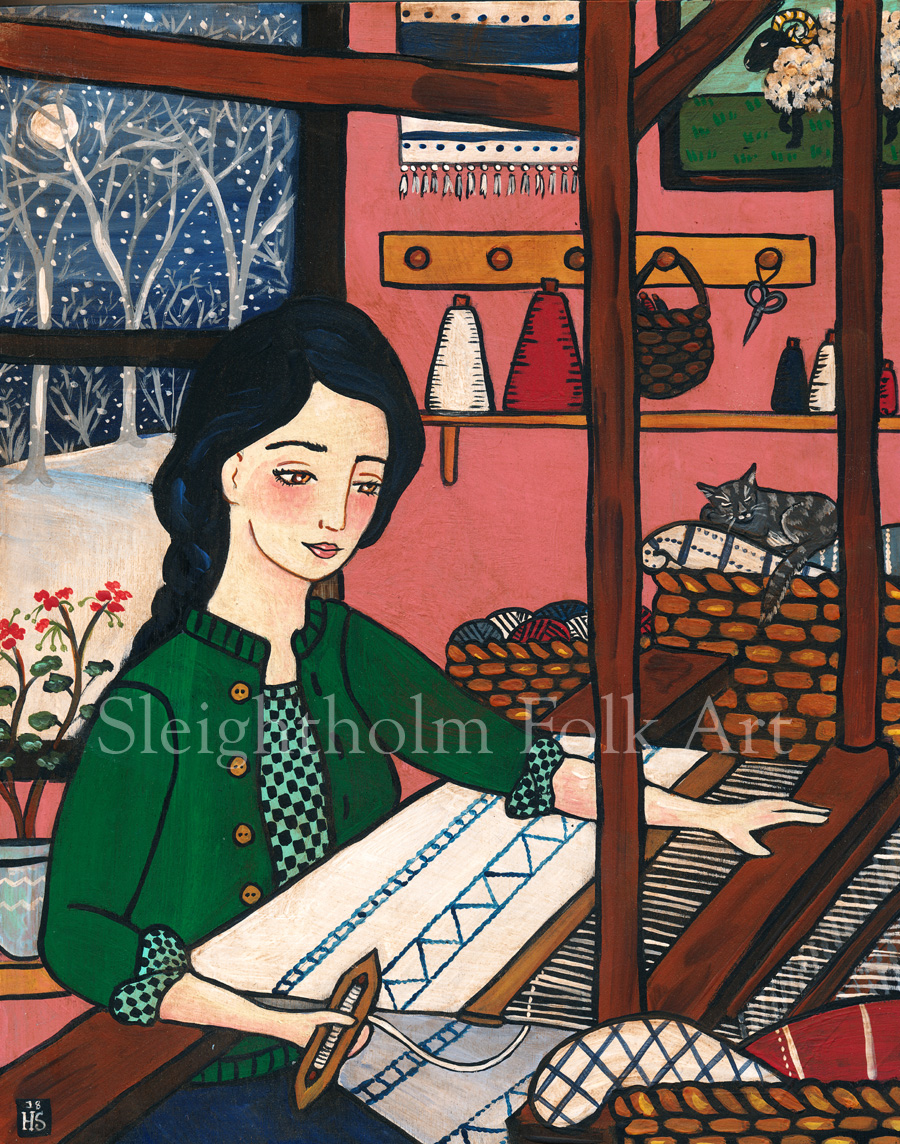 Last night I was out in the studio and was able to put the finishing touches on this latest painting– Winter Weaver. It seems I’ve caught the weaving bug, and have even acquired a loom! But Im still gathering parts and pieces to be able to really weave anything….until then, I’ll paint it!
