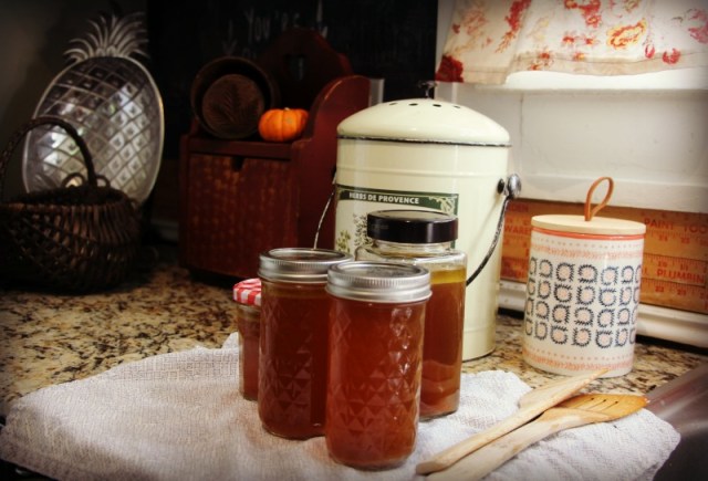 The next day, I strain our the bones and spent vegetables (They’ve lost their flavor and nutritional content to the stock by this time, so can be thrown out) and then strain the stock that’s been created into jars.