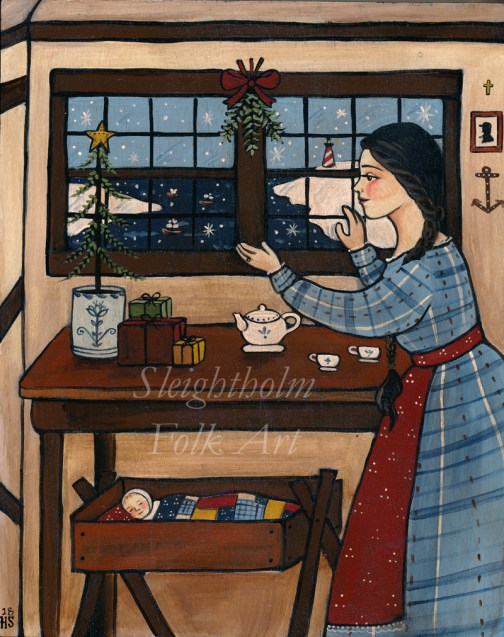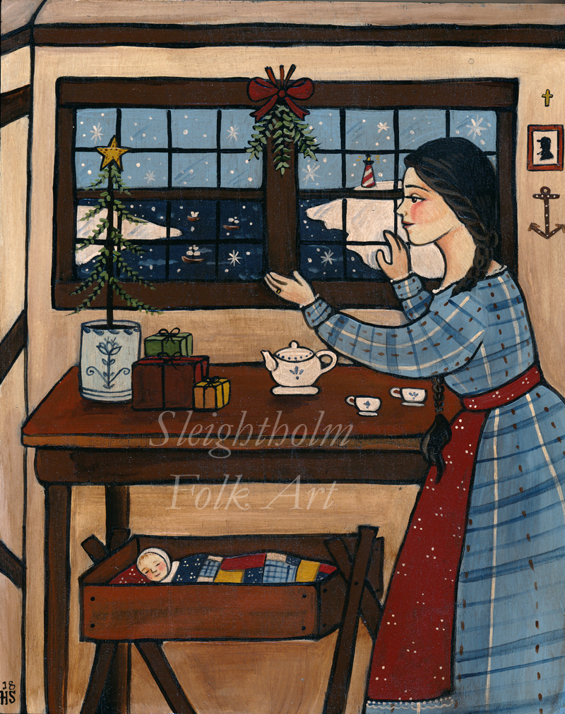 So in this piece, the young mother is at the window in excitement as three little ships enter a snowy harbor (somewhere in New England, of course!) in the background there is a lighthouse, beckoning them to shore. In the cozy cottage there is a humble Christmas tree with a small gathering of gifts and a tea set, and on the wall is a silhouette of her beloved and a small cross and an anchor. Tucked down in a little cradle is her new baby in a homemade quilt.