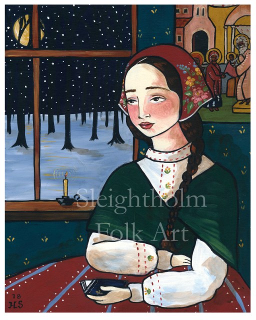 I wanted to share with you one of my newest paintings, that is all about winter, yet all about rich color too. This painting is “Winter Vigil” and it has a very meandering inspiration, and for all of that, I think it turned out so lovely! The seed for the idea of this painting came from the Christmas Album of British/Eastern European singer, Katia Melua, who was born in the country of Georgia. She sang a gorgeous rendition of Rachmaninoff’s “Nunc Dimittis, All Night Vigil.” Its considered one of the Russian masterpieces of music, and Melua’s version just pulls at my heart strings. This section of the piece also finds inspiration in The Presentation of Our Lord/ Purification of the Virgin Mary, and you’ll see that depicted in the icon behind the young woman who is keeping her Winter Vigil, candle in hand. The original is now sold, and I was so happy to hear that it went to a person who has been doing wonderful work with a church associated with the name of the icon! You can now buy prints of this piece, however, in my etsy shop.