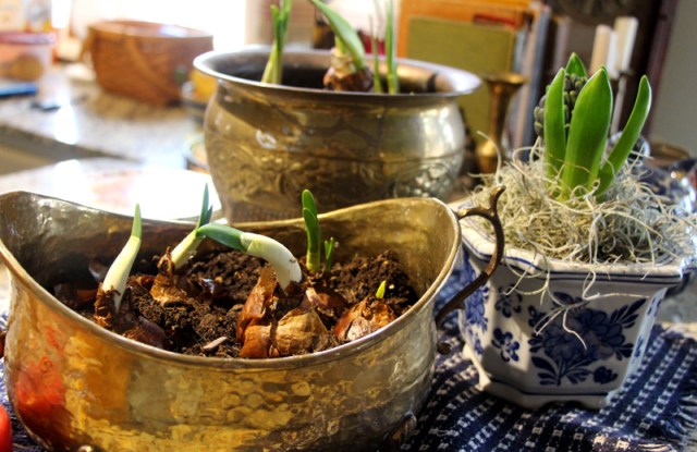 I also finally planted the bulbs I bought well…in December, thinking I’d have them out at Christmas! Well, that didnt happen….but the bulbs were still cheerfully ready to be planted and start to thrive near the dining room window. I planted paperwhites and then an Amaryllis in brass planters I’ve gotten at Estate sales and Good Will. I also found a little hyacinth in a pretty white and blue porcelain bowl at the grocery store of all places….and yes, that came home with me too! I’m a little glad I was behind in planting them all, so now we will have a little taste of spring as we wait out the rest of these winter days…