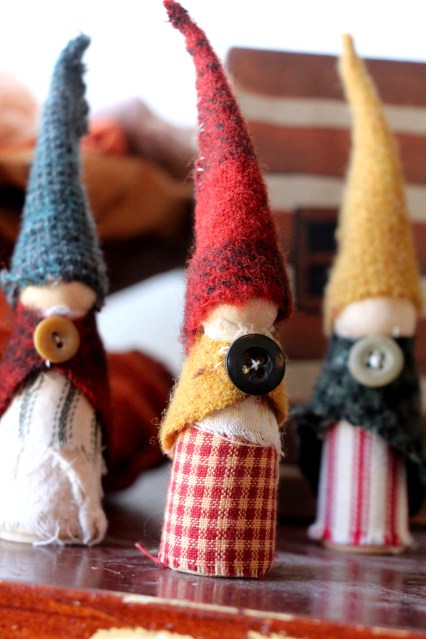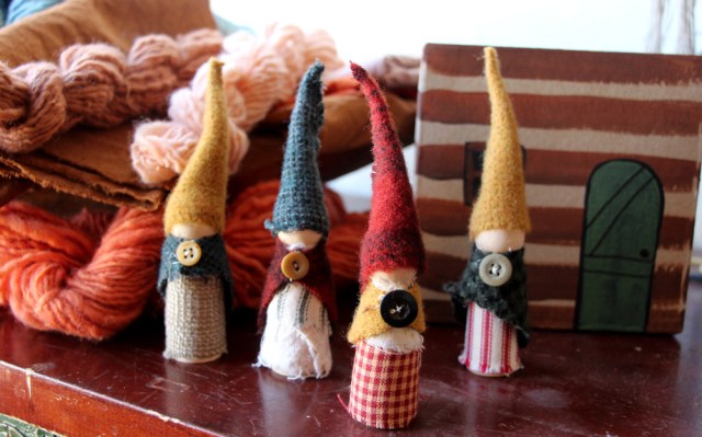I just finished these little gnomes for my son to give him tomorrow as a St Valentine’s Day treat! I got the idea from Sugarhouse Workshop, as she has a tutorial on making little Waldorf gnomes on her website. I highly recommend it! They were simple and a pleasure to create. I used some my dyed wool for rug hooking and wool applique for their hats and capes and I love the earthy colors of them. This wool is a bit of a hoarded stash for ‘someday’ projects but I decided “well, I have a project NOW and I’ll use it!” So, here they are….I also painted a little paper mache box I had on hand to look like a little cabin to store them in. So they have a house as well 😀