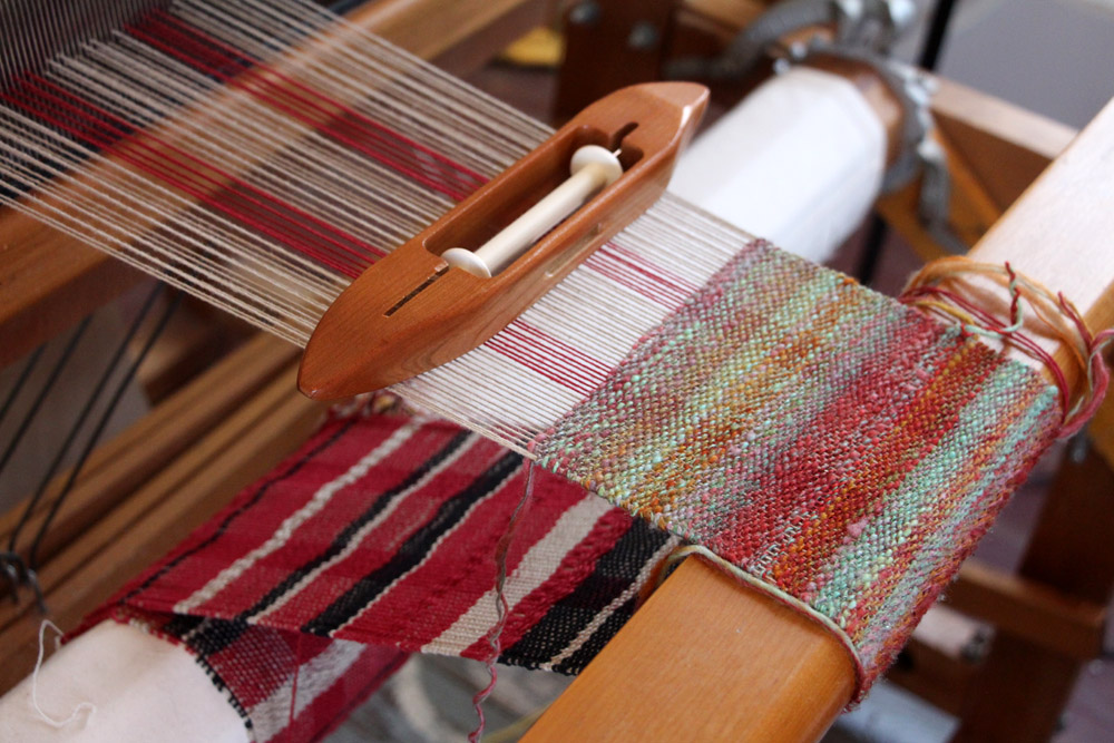 I’m also thrilled and very relieved to have the loom up and running again with a fresh warp. I have decided that warping a loom is very much an activity that takes a village. I have tried to do it on my own, but I cant get the tension right. Luckily my mother-in-law used to weave a lot and she was able to come over and help me get this thing operational. It is still a bit of a work in process— when I got the loom it didnt have its crank any longer, and to buy another one is about $80– at least. And, well, I just can’t bring myself to spend $80 on a crank! So I do it by hand 😉 seems to work alright! This is what I’ve got on the loom right now: