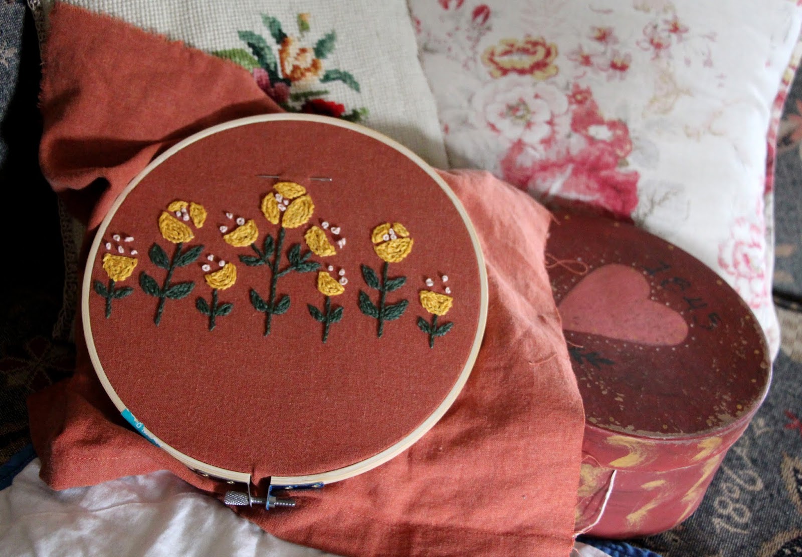 I recently finished many stitching projects that I’ve been cuddled up with this winter, one of which was this little series of flowers from the book Zakka Embroidery by Yumiko Higuchi. Her designs are sweet and whimsical and have a lovely mix of Japanese and Scandinavian aesthetic. I finished up these little yellow flowers on orange linen that used to be one of my painting aprons. Now its going to be a little zipper pouch to enjoy!