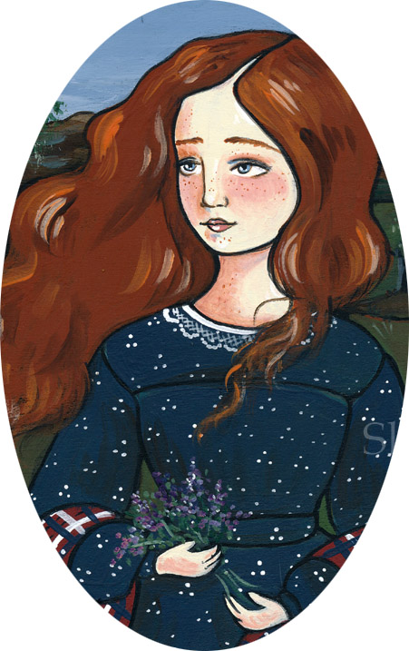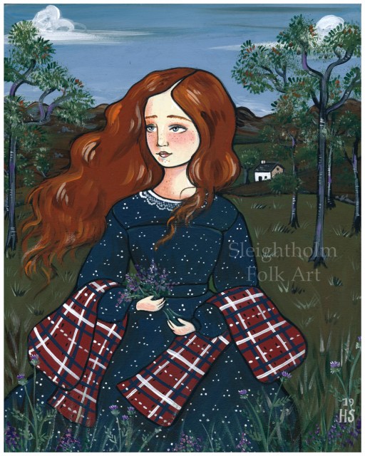 In the meantime, I’ve had lots of fun painting this pretty Scottish girl, wandering through a highland meadow picking a bouquet of heather and tramping through the thistle. I even added the Scotch pine, especially since it is the ‘plant badge’ of the McGregor clan (I’ve always loved pines! Is it genetic?! hehe)