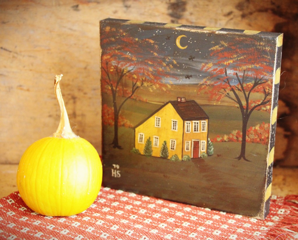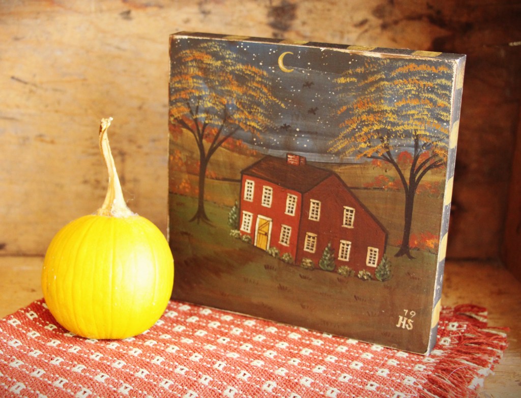 I also painted some small New England salt box style paintings, which are perfect to tuck into autumn decor. They are painted on wood panels that can be hung right on the wall, or they are also able to sit up on their end so that they can be on a shelf or mantle, etc. I think they look quite cute paired with a little pumpkin— this little bitty pumpkin actually grew in my garden! Now it’s saved for all posterity in these photos!