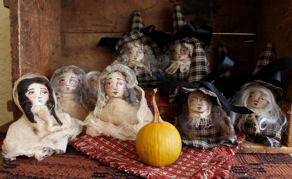 I also made several of my popular ghost and witch ornaments, all of which have their own unique personalities— even their own names! You can get to know each little lady in my etsy shop, they are always so much fun to make. They are created with cloth, paint and a bit of coffee stained cheese cloth! So they’re cute and smell amazing too! 🙂