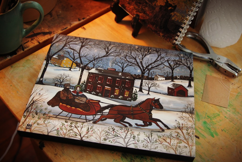 I’ve also been out in the studio, painting for Christmas– it has to be done! Because Christmas will be (it always is!) here before we know it. And I’ll be lamenting why I wasnt painting Christmas in the spring! It helps to listen to Christmas Carols, the old English ones are my favorites, making me think of still, snowy meadows and glossy holly bushes full of little winter birds, and ancient stone churches just over the hill-rise….