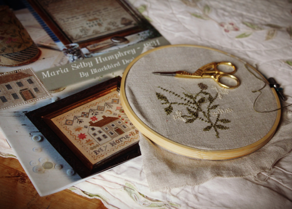 And while painting and reading seem to be my go-to endeavors as of late, I am still stitching when I can! I purchased a booklet from Blackbird Designs called Maria Selby Humphrey- 1831 and have enjoyed looking through it, and stitching up some tiny motifs from the designs inside. The booklet charts an actual antique sampler made by a young woman named Maria Selby Humphrey and also adds smaller projects inspired by the works.
