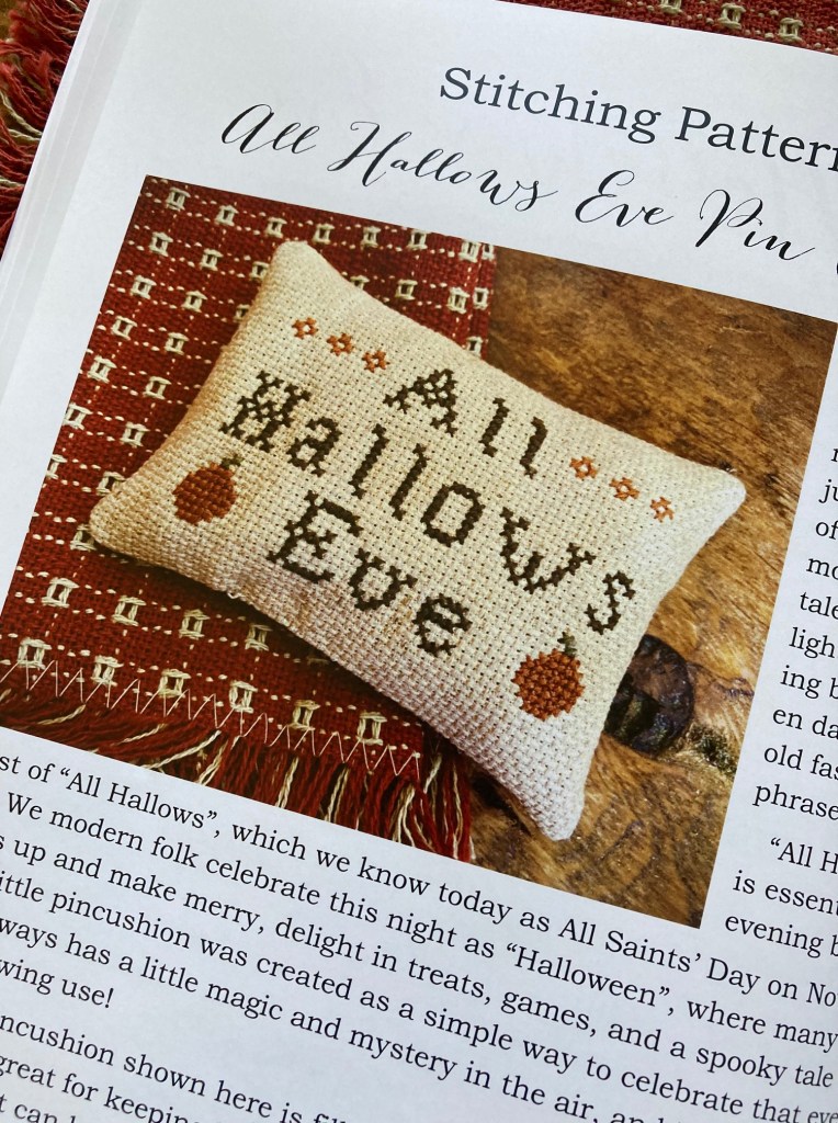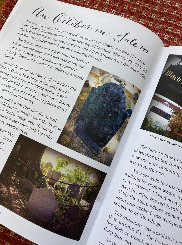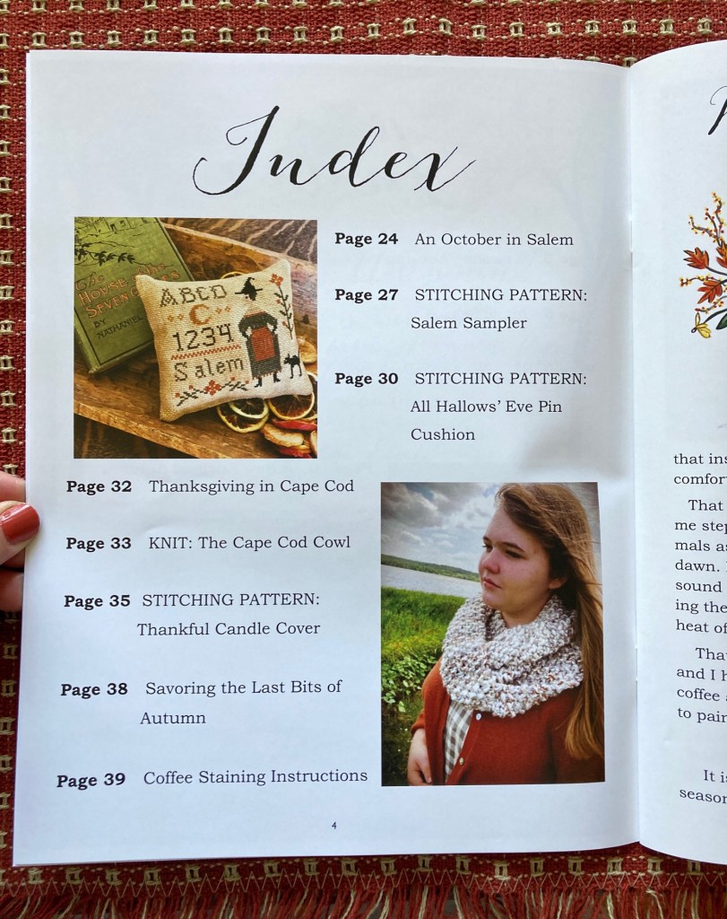 Within this booklet I share with you simple cross stitch patterns of my own design, my favorite (super easy!) cowl knitting pattern and also some of my own photos and art. I also share some of my favorite memories about “Autumn in New England”, “October in Salem” and “Heirloom Crafts in written sections. The projects included dovetail with the writings, and I hope it’s something you enjoy.